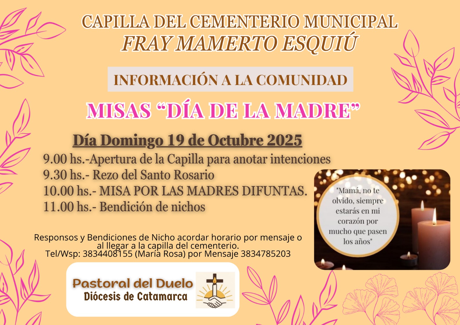 Con motivo del Día de la Madre, que este año se conmemora el domingo 19 de octubre, la comunidad católica invita a participar de una Misa especial en homenaje a las madres fallecidas, que se celebrará en el salón del cementerio municipal Fray Mamerto Esquiú.