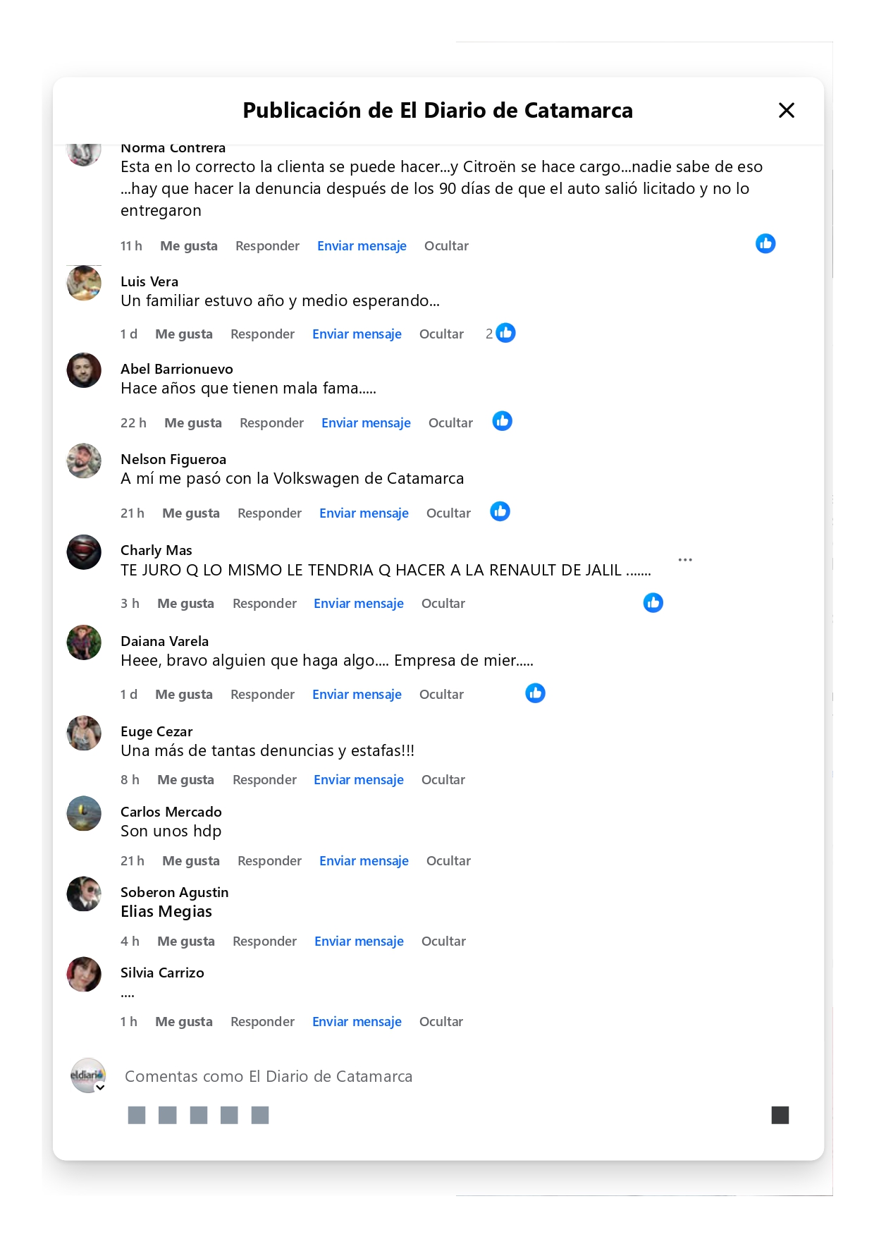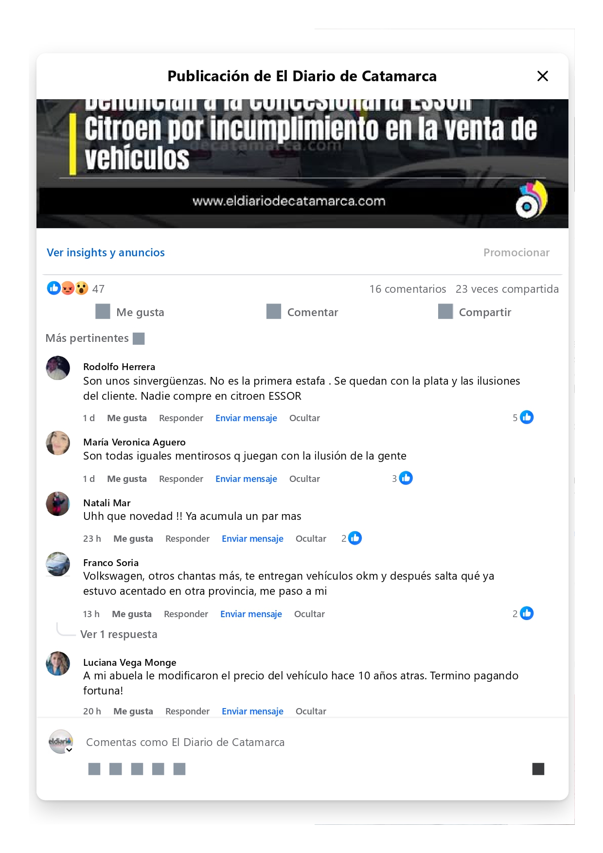 La opinión de una gran cantidad de lectores coinciden en destacar los incumplimiento de esta y otras concesionarias, en la entrega pactada de vehículos, cambios de precios, etcétera-eldiariodecatamarca.com
