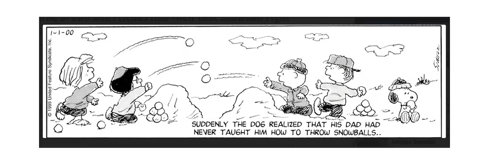 El 1 de enero de 2000 se publicó la última tira diaria de Peanuts en la que sucedía algo con entre los personajes. Snoopy se dio cuenta de que no sabía tirar bolas de nieve porque su padre no le había enseñado. El 2 se publicó una entrega semanal en color y el 3 de enero llegó la despedida