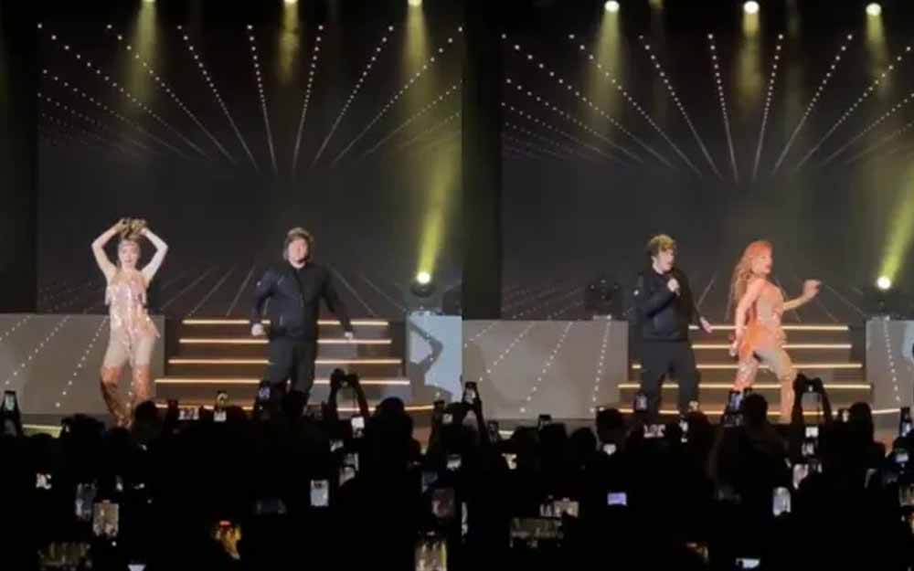 El Presidente asistió a la función encabezada por su ex novia y no desaprovechó la oportunidad para subir al escenario a cantar.