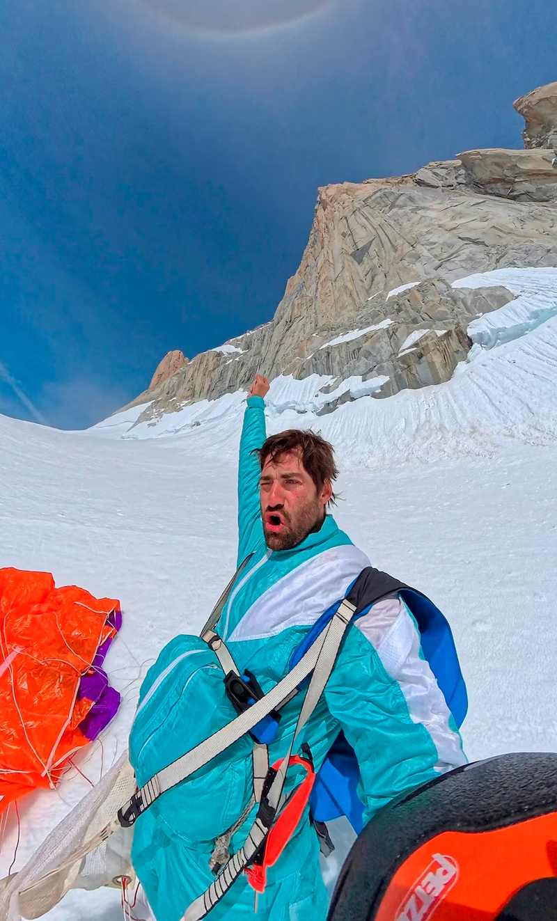 La felicidad de Egorov luego de haber aterrizado en una zona nevada del cerro, posterior al intrépido salto