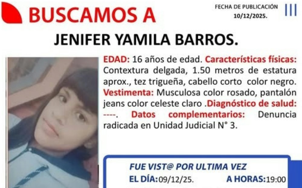 Se activó un operativo de búsqueda para dar con el paradero de Jennifer Yamila Barros, una adolescente de 16 años, quien fue vista por última vez el pasado 9 de diciembre en cercanías al Hogar Sipas Huasi, alrededor de las 19:00 hs.
