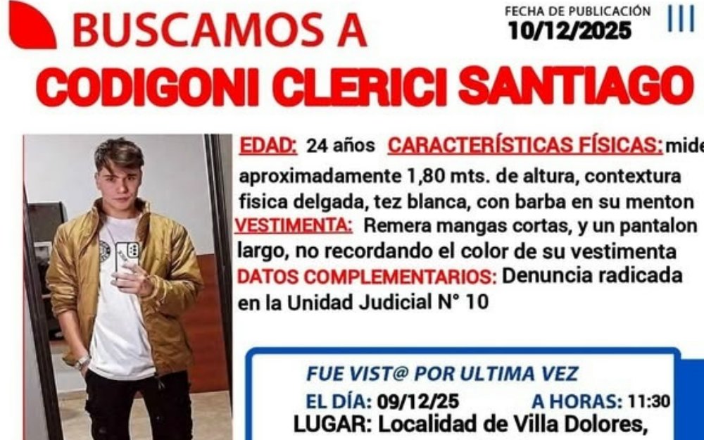 La Policía de la provincia emitió un alerta de búsqueda del joven Santiago Codigoni Clerici, de 24 años de edad, con las siguientes características físicas: