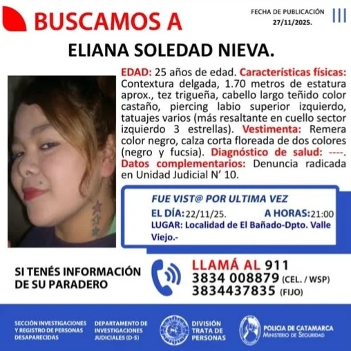 La Policía de Catamarca, a través de la División Trata de Personas, ha emitido un urgente pedido de colaboración a la comunidad para dar con el paradero de Eliana Soledad Nieva, una joven de 25 años de edad que se encuentra desaparecida desde hace varios días.