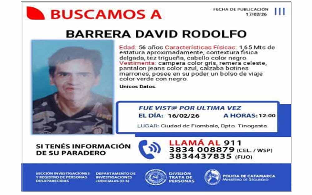 La Policía de Catamarca activó un pedido de búsqueda para dar con el paradero de David Rodolfo Barrera, de 56 años, quien fue visto por última vez el pasado 16 de febrero de 2026 alrededor de las 12 horas en la ciudad de Fiambalá, departamento Tinogasta.