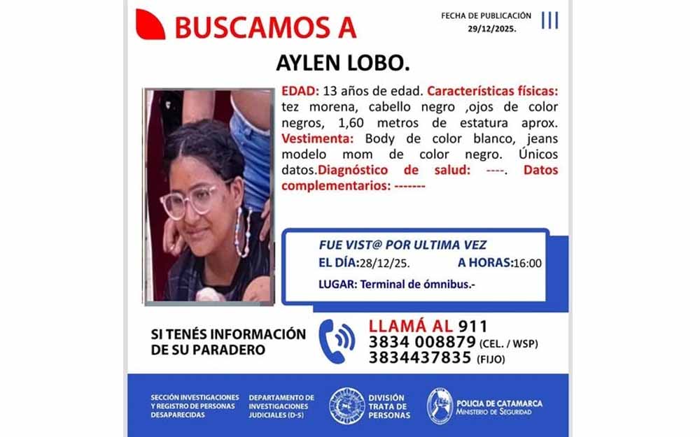 La Policía de Catamarca emitió un pedido urgente de colaboración para dar con el paradero de Aylen Lobo, una adolescente de 13 años, cuyo rastro se perdió este domingo alrededor de las 16:00 horas, en la terminal de ómnibus de la capital catamarqueña.