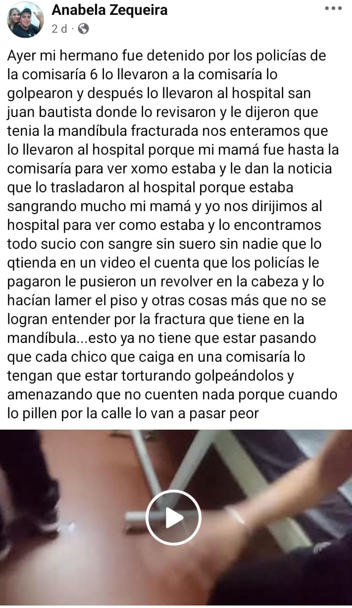 En el posteo, la mujer comentó que a su hermano “lo llevaron a la comisaría, lo golpearon y después lo llevaron al Hospital San Juan Bautista, donde lo revisaron y le dijeron que tenía la mandíbula fracturada”.