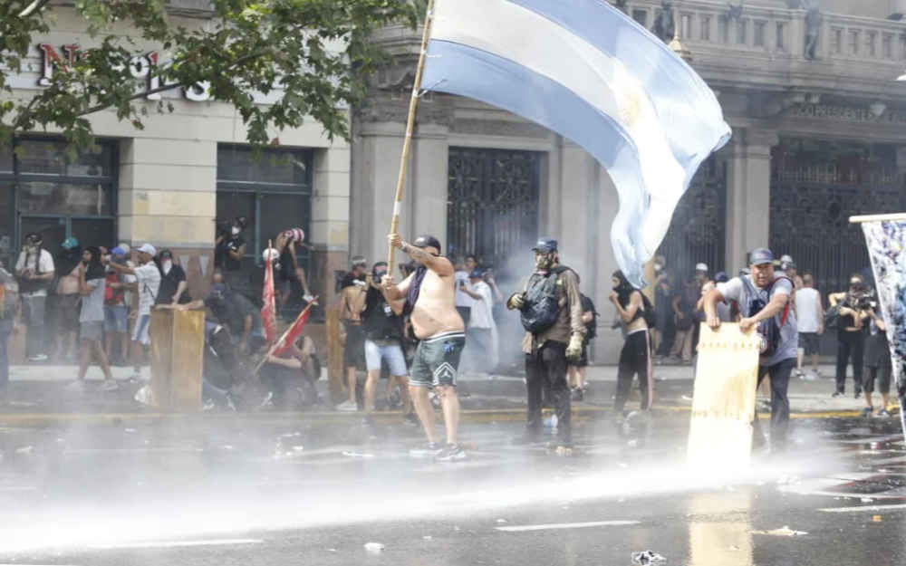 Guarecidos con bloques de madera, los manifestantes armaron bombas Molotov y enfrentaron a la Policía, que respondió con el camión hidrante y balas de goma. Por los incidentes hubo 7 detenidos, según indicaron fuentes de la Policía de la Ciudad a la Agencia Noticias Argentinas.