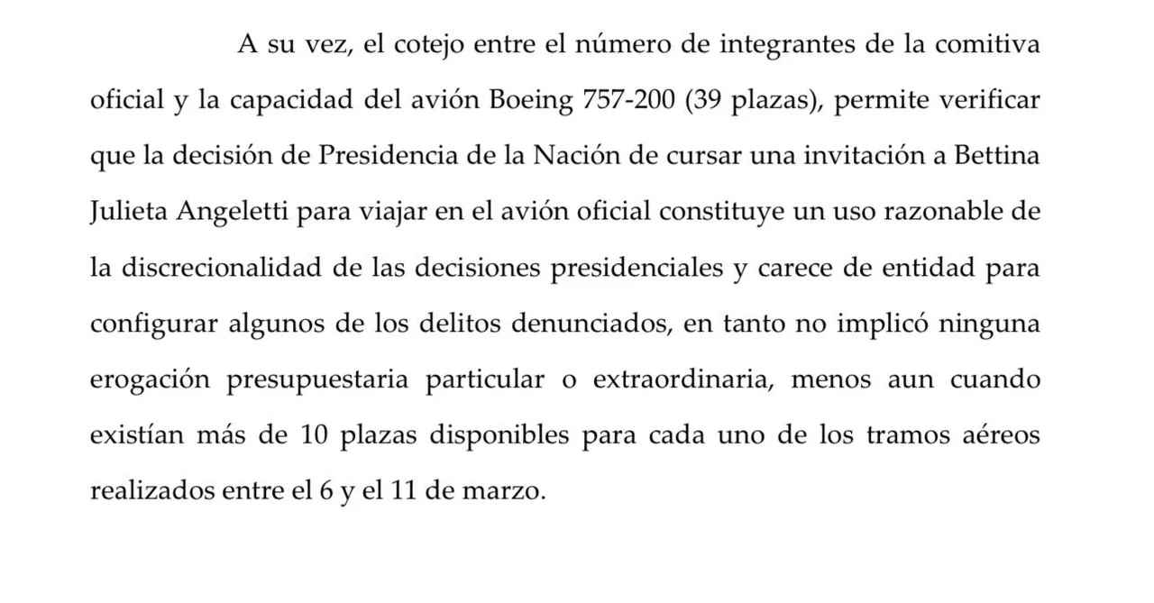 El dictamen también señala que la decisión carece de entidad para configurar los delitos denunciados, dado que no implicó erogación presupuestaria particular o extraordinaria y que existían más de diez plazas disponibles en cada tramo aéreo entre el 6 y el 11 de marzo, según pudo saber la Agencia Noticias Argentinas.