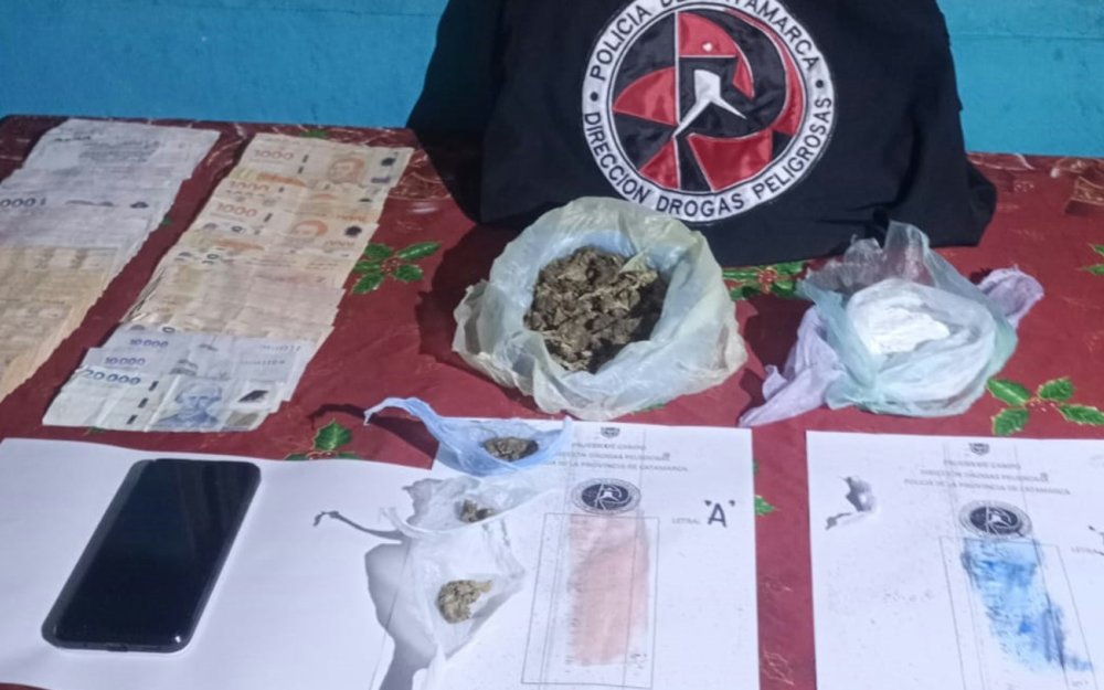 Fue tras un allanamiento en dos inmuebles ubicados en los barrios Romis Raiden y Montecristo, de la zona sur de la capital. Además de los estupefacientes y el efectivo, se decomisó dos teléfonos celulares. –eldiariodectamarca.com
