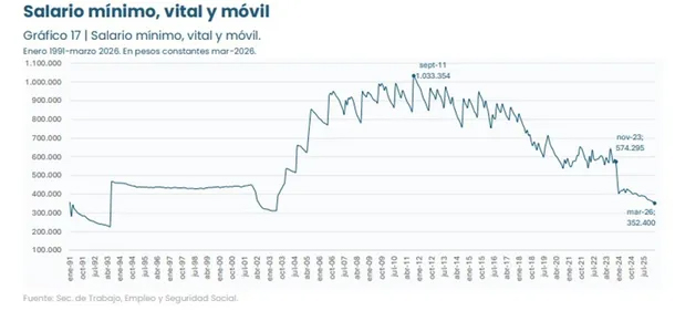 En marzo de 2026 el SMVM real se situó en 352.400 pesos, valor que equivale a 39% menos respecto de noviembre de 2023 y que representa aproximadamente un tercio del máximo histórico alcanzado en septiembre de 2011 (1.033.354 pesos en pesos de marzo de 2026). El informe advierte además que el nivel actual es incluso inferior al que existía en 2001, antes de la crisis de la convertibilidad.