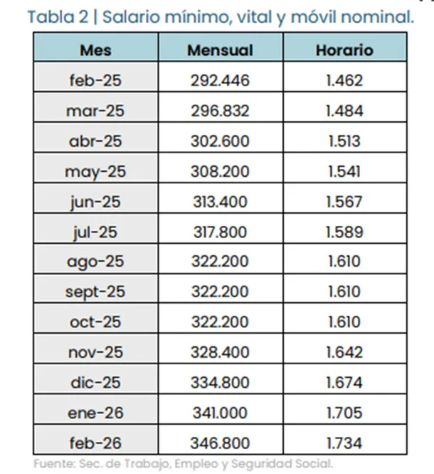 El salario mínimo nominal tuvo incrementos casi todos los meses del período analizado, pero estos aumentos no lograron superar la inflación. En diciembre de 2023, se produjo una caída del 15%, seguida por otra de 17% en enero de 2024. Posteriormente, los incrementos nominales mensuales (de 292.446 pesos en febrero de 2025 a 346.800 pesos en febrero de 2026) resultaron insuficientes frente al alza de los precios, lo que acentuó la pérdida de poder adquisitivo.